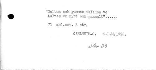 //// "Gubben och gumman talades ve ' //// taltes om nybt och gammalt"*..... //// 71 mel.not. 4 str. //// C ARLHEDI-G. S. L .M. 1892. //// * ////