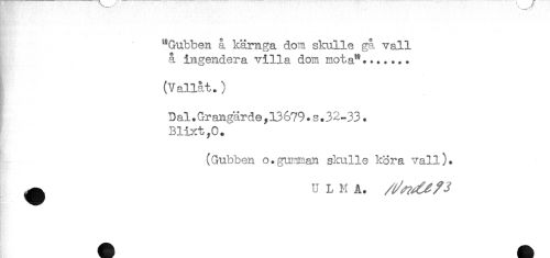//// "Gubben å kärnga dom skulle gå vall //// å ingendera villa dom mota"....... //// (Vallat.) //// Dal.Grangärde,13679.s.32-33. //// Blixt,0. //// (Gubben o.gunman skulle kora vall). //// ^ ULMA. ////