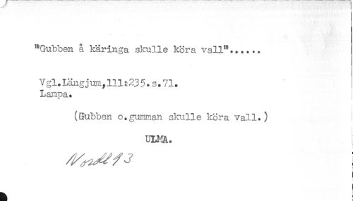 //// "Gubben å käringa skulle köra vall"...... //// Vgl.Längjum,111123 5.s.71. //// Lampa. } //// (Gubben o.gumman skulle köra vall.) //// : //// ULMA. //// < //// ! //// I //// ! ////