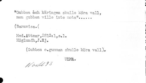 //// "Gubben och käringen skulle köra vall. ^ //// men gubben ville inte mota"...... //// (Barnvisa.( } //// L //// Med.Åttmary28l2:lyS.l. = //// Höglundh.J.Hj. ; //// (Gubben o.gumman skulle köra vall)* ! //// * L //// ULMA. ////