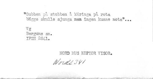 //// "Gubben på stubben å käringa på rota //// bägge skulle sjunga men ingen kunne nota"... //// Vg //// Bergums sn. //// IFGH 2841. //// NORD ms KOPIOR VISOR. ////