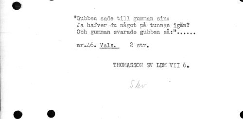 //// HH* //// /"Gubben sade till gumman sin: //// Ja hafver du något på tunnan igän? //// Och gumman svarade gubben så:"...... //// nr.46. Vals. 2 str. //// THOMASSON SV LDM VII 6^ ////