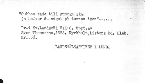 //// "Gubben sade till gumman sin: //// ja hafver du något på tunnan igen"...... //// Tr.i Sv.Landsmål VII:6. Uppt.av //// Sven Thomasson,l884. Kyrlthult^Listers hd. Blek, //// nr.558. //// LMDS-dLSARKIVET I LUND. //// - ////