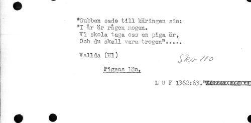 //// "Gubben sade till käringen sin: //// "I år är rågen mogen* //// Vi skola taga oss en piga är. //// Och du skall vara trogen"..... //// Valida (Hl) //// Pigans lön. //// L U F 1362:63.'^EBBEXXXEiSBGE ////