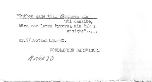 //// "Gubben sade till käringen sin //// uti dansike, //// ks.ra mor lappa byxoma min bak i //// ansigte^..... //// nr.9 0. Gotland * S.-HC. //// NCR3LBIDER BARi^ISCR. ////
