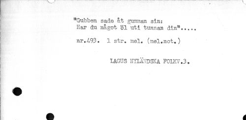 //// I "Gubben sade åt gumman sin: //// j Har du något öl uti tunnan din***,... //// _ nr.493. 1 str. mel. (mel.not.) //// . //// * //// LAGUS NYLiLNDSKA F0LKV.3. //// A ////