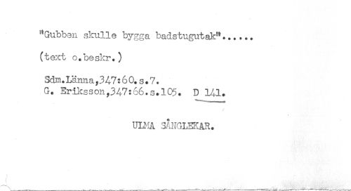 //// ^Gubben skulle bygga badstugutak"...... //// (text o.beskr.) //// Sdm.Lännay347:60.s.7. //// G. Erikssony347:66.s.lC5. D 141. //// ULMA SANGLEKAR. //// t ////