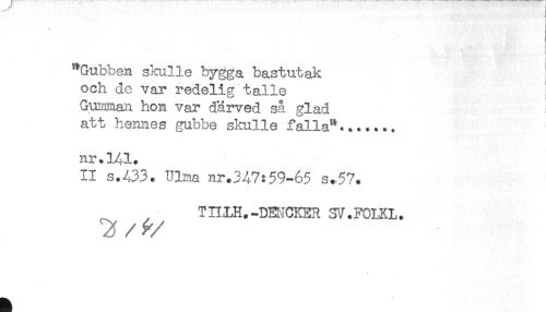 //// "Gubben skulle bygga bastutak //// och de var redelig talle I //// GuHHnan hon var därved så glad i //// att hennes gubbe skulle falla"**...*. //// nr. IZ-l* //// II s.433. Ulna nr.3A7:59-65 s.57. //// TnJLH.-DEMCKBR SV.FOIXL. ////