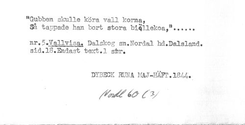 //// "Gubben skulle kora vall koma? //// Så tappade han bort stora bi^llekoa/'...... //// nr.5.Vallvisa. Dalskog sn.Nordal hd.Dalsland, //// sid.18.Endast text.l str. //// DYBECK RUNA MAJ-1^.18/4. ////