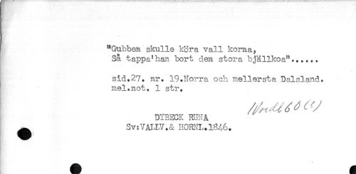 //// "Gubben skulle köra vall korna, //// Sa tappa*han bort den stora bjällkoa"...... //// - //// ! ' //// sid.27. nr. 19.Norra och mellersta Dalsland, //// mel.not. 1 str. //// DYBECK RUia //// ^ Sv:7ALLV.& HOmJL.1846. ////