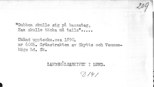 //// "Gubben skulle sig på bassatag, //// Han skulle täcka mä talla"..... //// Okänd uppteckn.cta 1890. //// nr 6006. Gränstrakten av Skytts och Vemmen- //// hogs hd. Sk. //// LMDSmLSARKWET I LUND. ////