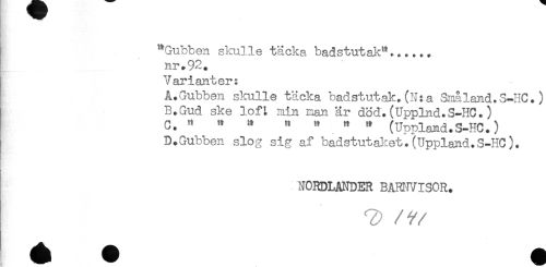 //// "Gubben skulle täcka badstutak"...... //// nr.92. //// Varianter: //// A.Gubben skulle täcka badstutak.(N:a Småland.S-HC.) //// B.Gud ske loH min man är dÖd.(Upplnd.S-HC.) //// C. " " " " " " " (Uppland.S-HC.) //// D.Gubben slog sig af badstutaket.(Uppland.S-HC). //// NORDLANDER BARNVISOR. ////
