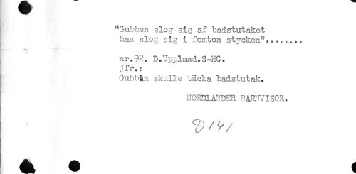 //// "Gubben slog sig af badstutaket //// han slog sig i femton stycken"... //// nr.92. D.Uppland.S-HC. //// jfr.: //// Gubben skulle täcka badstutak. //// NORDLANDER BARNVISOR. //// //// /