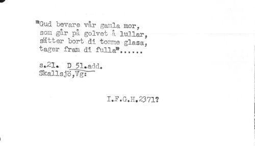 //// "Gud bevare vår ganla mor, //// som går på golvet å lullar, //// sätter bort di tonnie glasa, //// tager frai^i di fulla"...... //// i //// s.2l. D 51*add. //// SkallsjH/TgT" //// i //// i //// i //// , //// I.F.G.H.2371? //// < //// ! //// r //// t //// t //// i ////