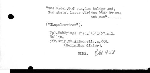//// - //// ! //// "Gud Fader,Gud son^den helige And, //// Son skapat haver världen både kvinna //// ^^ och man^....... //// (" Skapel sevi san"). //// - //// Upl.Enköpings stad,3Q3:1057.s.l. //// Hallin. //// jfr.Grip,Sv.AlLnogeliv.s.205. //// (Religiösa dikter). //// uim. ^ ^ ////