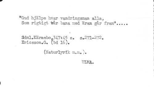 //// "Gud hjälpe hvar vandringsman alla. //// Som rigtigt Tnar bana med äran gar fram"..... ! //// C j //// Sdml.Kämebo .347:45 a. s.^71-272. ! //// Ericsson.G. (bd 16). //// i //// (Naturlyrik m.m.). ! //// UU^A. //// t ////