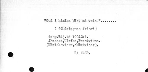 //// "Gud i himlen täst må veta-"........ //// ( 90-åringens frieri) //// insp.Btj.bd 19920:1. //// Jon s s on, Ulrika, Fr o stviken. //// (Kärleksvisor ysMimtvisor). //// C' //// B*' //// ^ RA BI3P. ////