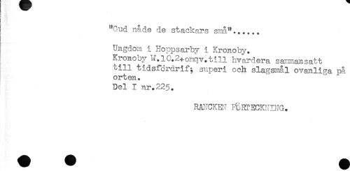 //// ! //// ! //// ! //// "Gud nåde de stackars små"...... //// Ungdom i Hoppsarby i Kronoby. //// Kronoby W.10.2+omqv.till hvardera sammansatt //// till tidsfordrif; superi och slagsmål ovanliga på //// orten. //// Del I nr.225. //// RATCKE" ^.RTECKNING. ////
