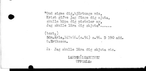 //// r' //// ^^ "Gud signe dig,hjärtunge min, //// ^ Krist gifve jag finge dig njuta, //// } skulle köpa dig pistoler ny, //// Jag skulle lära dig skjuta"...... //// (text.) //// Sdni.Arla,347:66. (s.94) s.96. D 190 add. //// G.Eriksson. //// ! //// ! //// i //// Jag skulle lära dig skjuta etc* //// LANDS-IÅLSARXIVET //// UPPSALA: //// _ //// _ ^ - ' ////