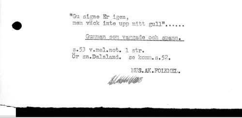 //// ^Gu signe Er igen, //// ^ men väck inte upp mitt gull".,.... //// Gumman som va^^ade och spann. //// * //// s+53 v.mel.not. 1 str. //// Or sn.Dalsland. se komm.s.52. //// HUS.ÄK.FOmfEL. ////