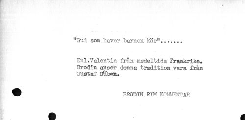 //// "Gud som haver barnen kär"....... //// Enl.Valentin från medeltida Frankrike. //// Brodin anser denna tradition vara från //// Gustaf D(ib<3R. //// ^ BRODIN RIM KOH-IH^AR //// - ////