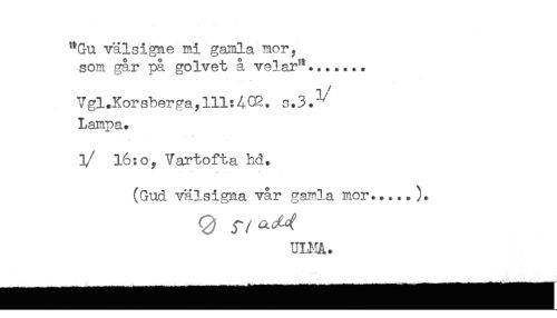 //// "Gu välsigne mi gamla mor, //// som gar pa golvet å velar"....... //// V gl .K or sberga, 111: A CS, s. 3. ^ //// Lampa. //// V 16:o, Vartofta hd. //// *. ......... * //// (Gud välsigna vår gamla mor.....). //// Q r/^ ////