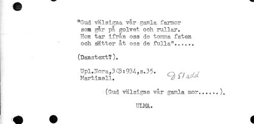 //// "Gud välsigna vår gamla farmor //// som går på golvet och rullar. //// Hon tar ifrån oss de tomma faten //// och sätter åt oss de fulla"...... //// (Danstext?). //// Upl.Nora,3Q3:93AyS.35. ^ , , //// Martinell. ^ //// (Gud välsigne vår gamla mor......). ////