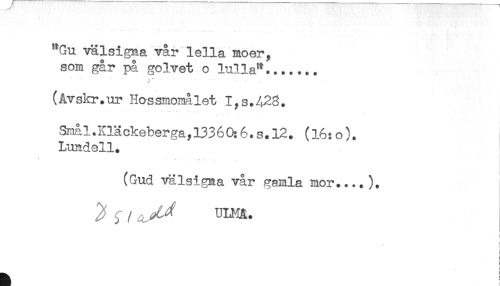 //// "Gu välsigna vår lella möer, //// som går på golvet o lulla"....... //// * * .... - . .. //// (åvskr.ur Hossmomålet I,s.42g. //// Små 1. Kläckeberga, 133 6 0:6. s. 12. (16: o). //// Lundell. //// i //// i //// (Gud välsi^gna vår gamla mor....). //// i //// < //// t ////