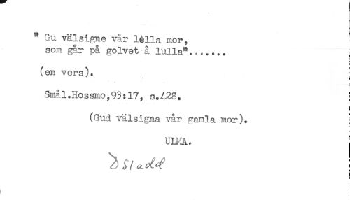 //// " Gu välsigne vår lélla mor, //// som går på golvet å lulla*....... ! //// t. //// (en vers). //// * r //// Smål.Hossmo,93:17, s.428. //// (Gud välsigna vår gamla mor). } //// - //// ULHå. //// ^ r/ ^^ I //// < ////