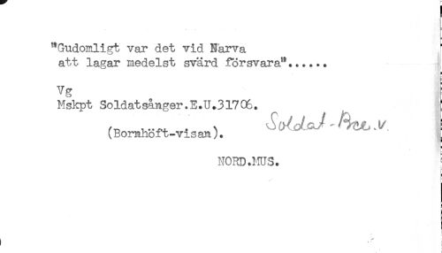 //// "Gudomligt var det vid Närva //// att lagar medelst svärd försvara"...... ! //// a //// vg //// Mskpt Soldat sånger.E.U.317 06. //// (Bomhoft-visan). //// NORD.HUS. ! //// f //// t //// ^ //// ! //// i //// t ////