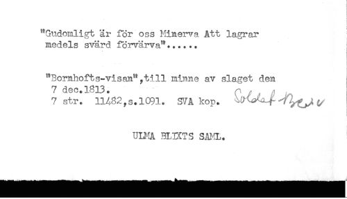 //// ^Gudomligt är för oss Hinerva Att lagrar //// medels svärd förvärva"...... //// * i //// < //// * //// "Bomhofts-visan" ,till ninne av slaget den //// 7 dec.1813. n - . ,, //// 7str. UA82,s.l091. yJAkop. //// i //// ULMA BLIXTS SAHL. ////