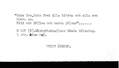 //// "Guds fre,Guds fret Alla blinda och alla som //// kunna se. //// Frid och hällsa och varna pälsar**....... //// B 205 (2).¥ästg3teknallens kända hälsning. //// 1 str. Utan mgl. //// MOLIN CREB3C. ////