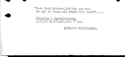 //// ) //// ^Guds frid härinnefar och mor. //// De små de koirna med fröjd till huset'*..... //// Helsninx i Barnsölstu^an. //// nr.17.mel.not. 5 str. //// åFZELIUS FOLKSHARPM. //// ! //// . ////