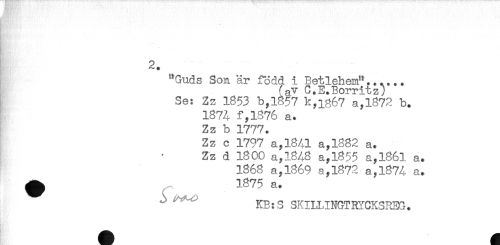 //// 2. //// "Guds Son är född i Betlehem"...... //// (av C.E.Borritz) //// Se: Zz 1853 b,1857 k,ig67 a,1872 b. //// 187A f,l876 a. //// Zz b 1777. //// Zz c 1797 a,1841 a,1882 a. //// Zz d 1800 a,l8A8 a,l855 a,1861 a. //// 1868 a,1869 a,1872 a,1874 a. //// ^ 1875 a. //// KB:S SKILUNGTRYCKSREG. ////