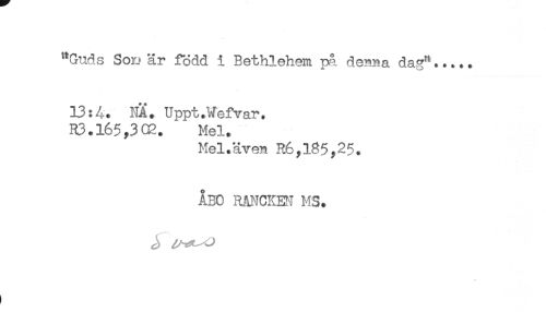 //// "Guds Son är född i Bethlehen på. denna dag"..... //// 13:4. NÄ. Uppt .Wefvar. //// 33.165,3 GB. Mel. //// Mel.även R6,l85,25. //// ÅBO RANCKEN MS. ////