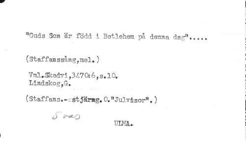 //// - //// f //// "Guds Son är född i Betlehem på denna dag"..... ! //// 8 //// * * //// (Staffanssång,mel.) //// ! //// Vml^Skedvi, 3 47 0:6, s. 10. //// LindskogyG. ! //// .... -- . .- . . . . _ r //// ) //// (Staffans.-.-stjärAg. 0."Julvisor".) //// i //// UUIÄ., ! //// . ////