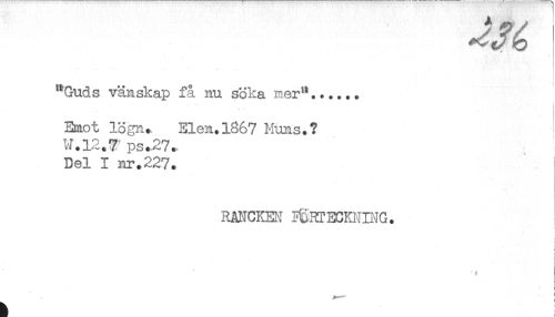 //// "Guds vänskap få nu söka ner"...... //// Emot lögn. Elen.1867 Muns.? //// W.12.T ps.,27.. //// Del I nr.227. //// RANCKEN FÖRTECKNING. //// ! //// i ////