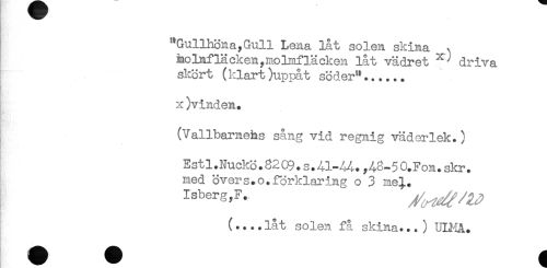 //// "Gullhöna,Gull Lena låt solen skina //// molnfläckenymolmfläcken låt vädret ^ driva //// skört (klart)uppåt söder"...... //// x)vinden. //// (Vallbarnehs sång vid regnig väderlek.) //// Estl.Nuckö.8209.s.41-^.,A8-50.Fon.skr. //// med övers.o.förklaring o 3 me^. //// Isberg,F. //// (....låt solen få skina...) ULMA. ////