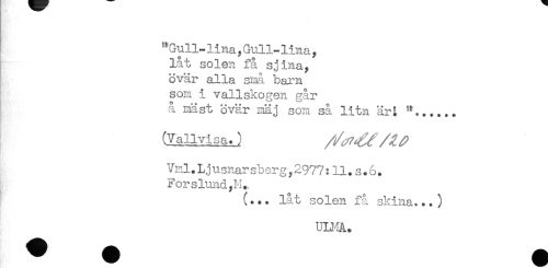 //// "Gull-lina,Gull-lina, //// låt solen få sjina, //// övar alla små barn //// som i vallskogen går //// å mast övär mäj som så litn ärL "...... //// (Vallvisa.) , ' ^ //// Vnl.L,jusnarsberg,2977:11. s.6. //// Forslund,1-1. //// (... låt solen få skina...) //// ULMA. ////
