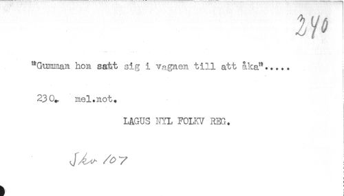 //// < //// "Gumman hon satt sig i vagnen till att åka"..... //// * //// 230^ mel. not. //// 1 //// LAGUS NYL FOLKV RBG. //// r //// J ////
