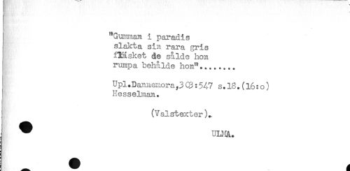 //// ' - * //// "Guiman i paradis //// slakta sin rara gris //// fTäsket de sålde hon //// rumpa behålde hon"........ //// Upl.Dannenora,3 CB: 547 s.18.(16:o) //// Hesselinan. //// (Valstexter).. //// ^ ULMA. ////