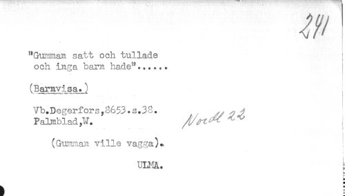 //// "Gumman satt och tullade ; //// och inga barn hade*^'...... //// (BaTmvis^) //// Vb.Degerfors,S6$3.s.3S. //// Parblad ^ //// < //// t //// (Gumman ville vagga)* //// ULMå. ^ //// F //// H ////