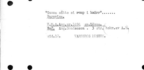 //// "Gujmna satte si ramp i knorr"....... //// ^ Barnvisa. //// V....- //// V.M.Å.Acc.nr.3494 sn.Länna. / //// Ref. Ang. Bondesson . 3 str.: hskr.av A. B. //// ^ \ / //// ! sid. 12. VARBERGS lIUSEUi:. ////