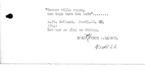 //// "Gumman ville vagga, //// ^^ men inga barn hon hade"........ //// s.36. Småland. Nordl.22. SE. //// jfr.: //// Det var en gång en käring. //// STmLviSOR o.RÄl^SCR. ////