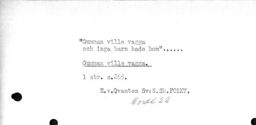 //// H.i-:- ' //// "Gumman ville vagga //// och inga barn hade hon"...... //// Gunman ville vaR^a. //// 1 str. s.265. //// [ //// ____E. v.Qvant en Sv:S.Sk.FOLKV. ////