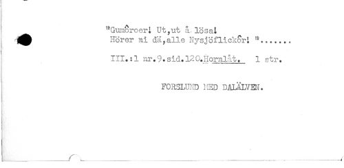 //// "Gumoroeri Ut,ut å. lösat //// ^ Hörer ni dä,alle Nysjöflickor^ //// III.:1 nr.9*sid.12 0.Hornlåt. 1 str. //// / .T—t < ........ml ...... n //// . //// FORSLUND HED DALÄLVEN. ////
