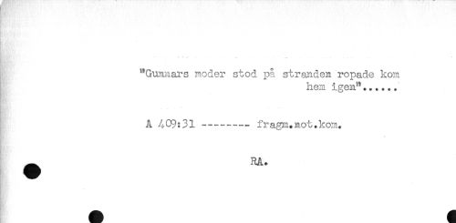 //// - //// HH^L-i..... //// "Gunnars moder stod på stranden ropade kom //// hem igen"...... //// A 409:31 —------fragm.not.kom. //// ^ RA. //// K ' ////