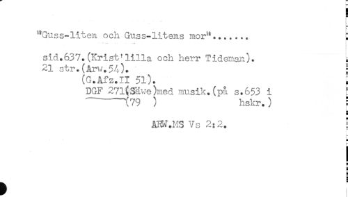 //// H //// "Guss-liten och Guss-litens mor"....... : //// *.... * * " //// sid.637.(Krist'lilla och herr Tideman). t //// 21 str.(Arw.54). ! //// (G.Afz.II 51). ! //// DGF 271'(Säwe)med musik, (på s.653 i //// (79 ) hskr.) E //// s //// ARM.MSVs2:2. ' //// i //// r //// i //// 5 //// g //// H ////