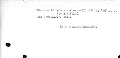 //// "Gustave Ädolphe svenskes sköld och bistånd"...... //// (av E.J.FaB^). //// Se: Upps.Z.F.s. 16:1* //// KB:S SKILLIHGT RYCKSREG. //// t it!' ////