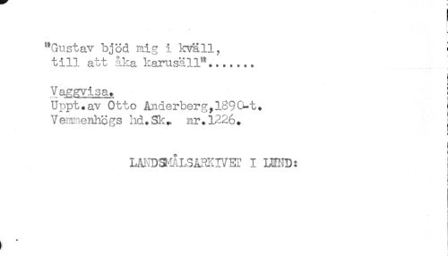 //// .... //// * //// "Gustav bjöd mig i kväll, ! //// till att åka karusäll" ....... //// I //// Vaggvisa. ! //// Uppt.av Otto Anderberg,1890-t. ^ //// Vemmenhögs hd.Sk. nr.1226. ^ //// s //// ! //// LANDadLSÅRKIVET I IHND: ! ////